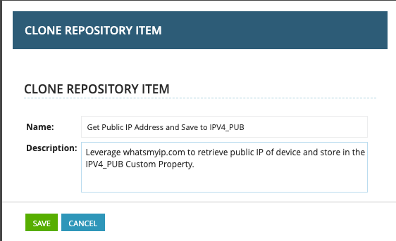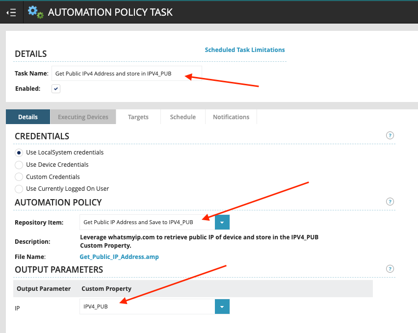 - Schedule an Automation Policy to store devices’ public IP addresses to the IPV4_PUB custom property
