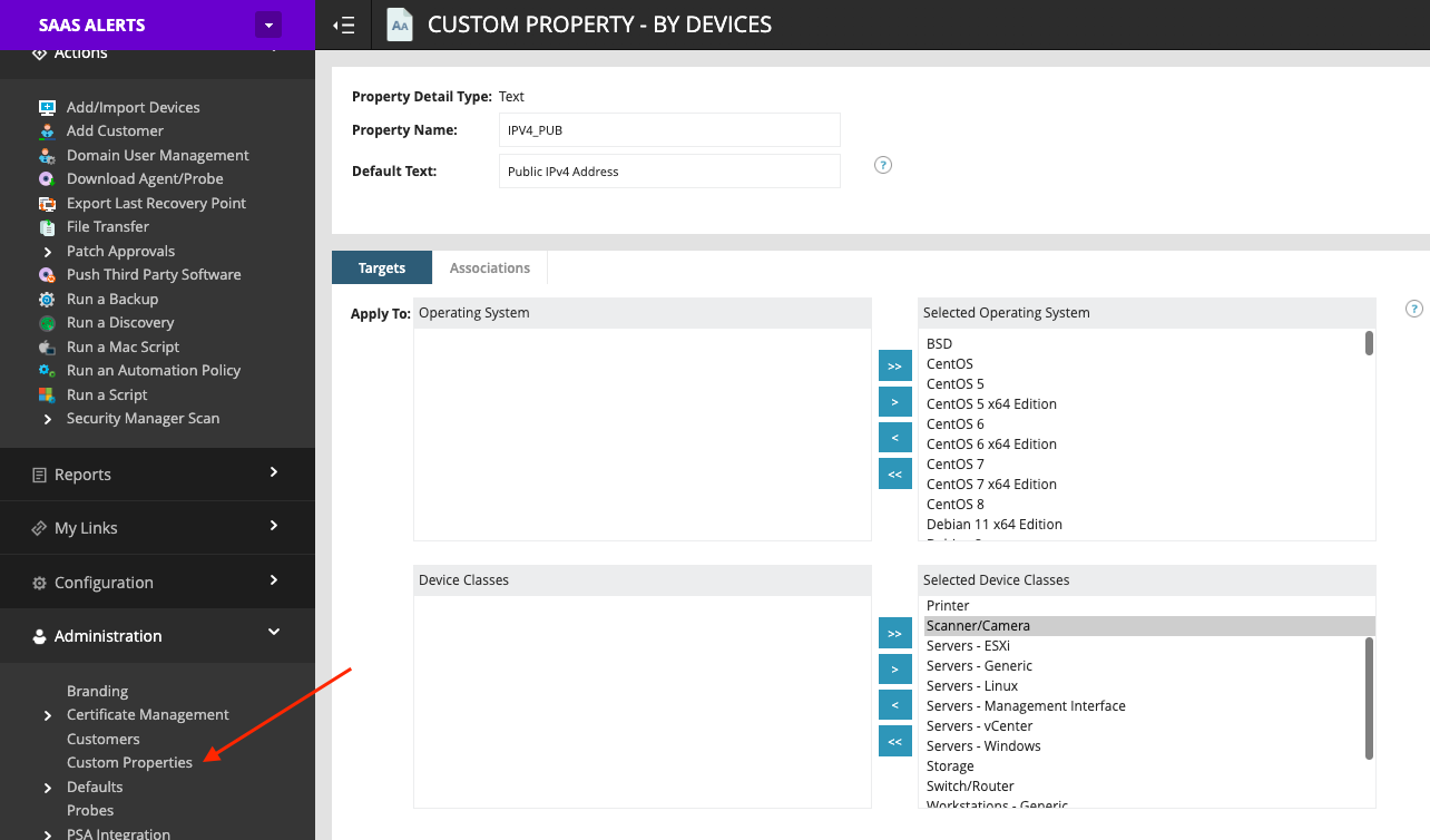 - Set the Property Name to IPV4_PUB, the Default Text to Public IPv4 Address, and ensure that all Operating Systems and all Device Classes are selected by pushing the >> arrows on each list.