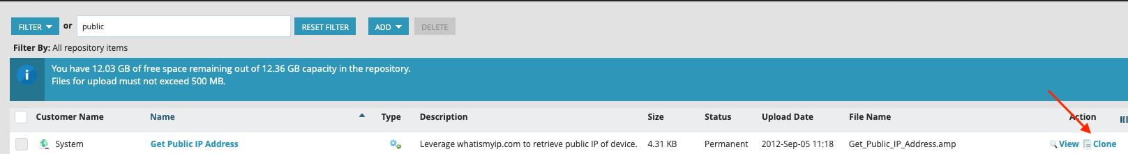 - In the Search bar at the top, enter public, and then click Clone on Get Public IP Address.