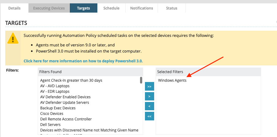- Output Parameter (IP): IPV4_PUB - On the Automation Policy Task\Targets tab, ensure Windows Agents is in the Selected Filters section.