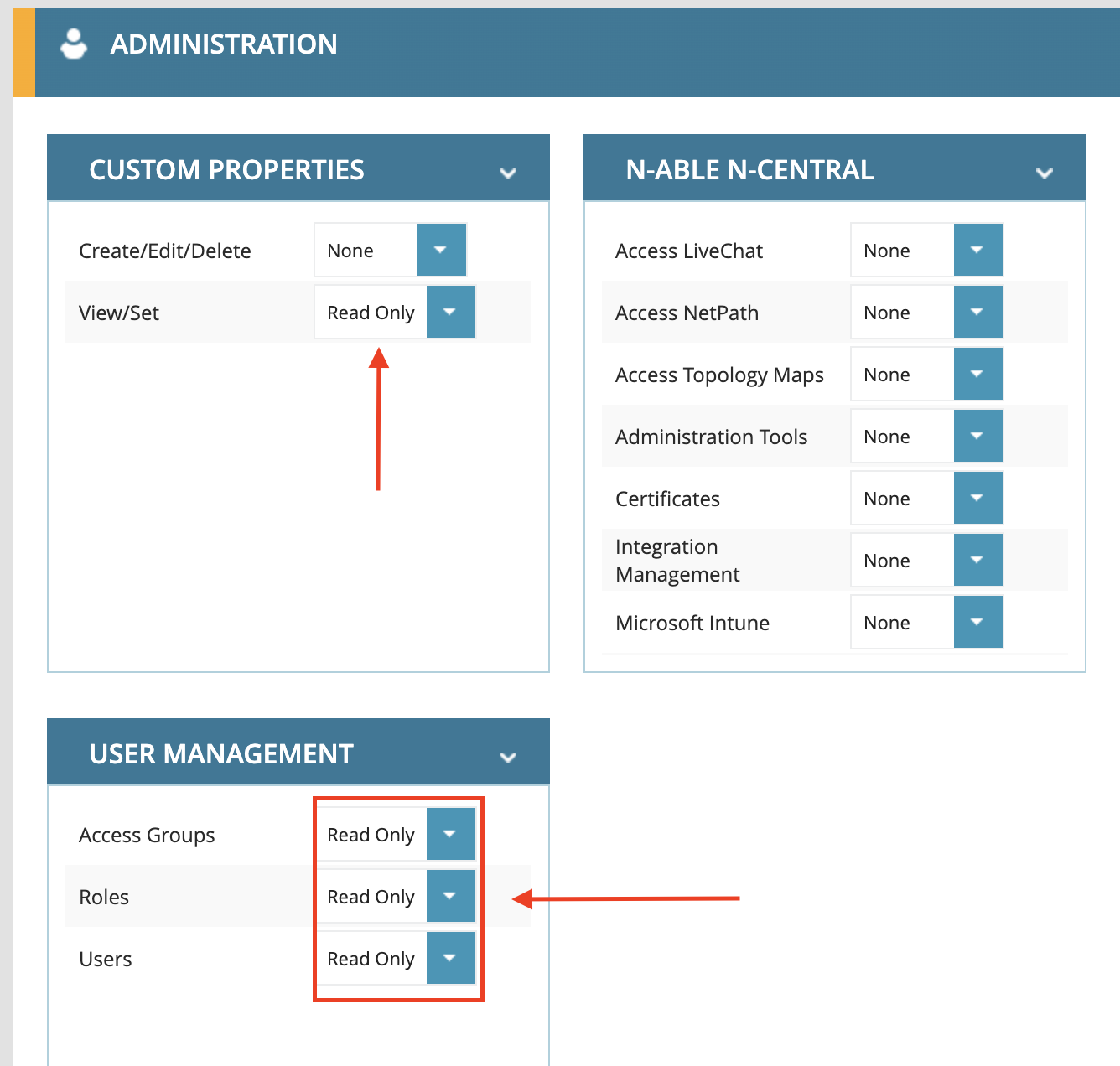 - Scroll down Custom Properties\ View/Set and select Read Only. Then, go to Administration\User Management and select Read Only for Access Groups, Roles and Users.