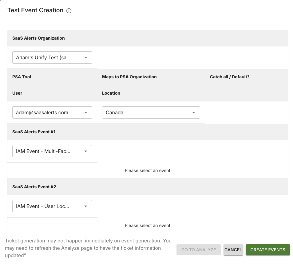 - You will be brought to the Analyze screen where you can see the test events that were generated and receive a link to the Halo PSA ticket that was created for the events. If there are any errors, you will see those here as well.