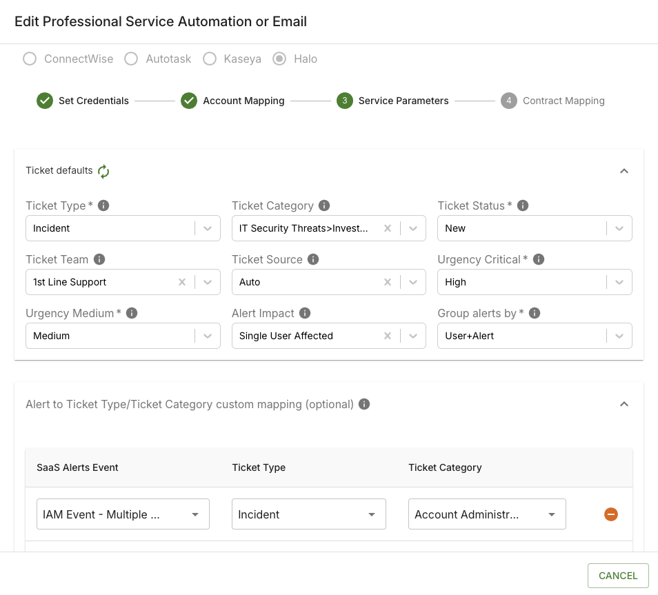 - Most of the settings on this screen are specific to Halo PSA and will be set according to your particular needs, automations and workflows for triaging tickets generated from SaaS Alerts. Required fields are marked as such with an asterisk.