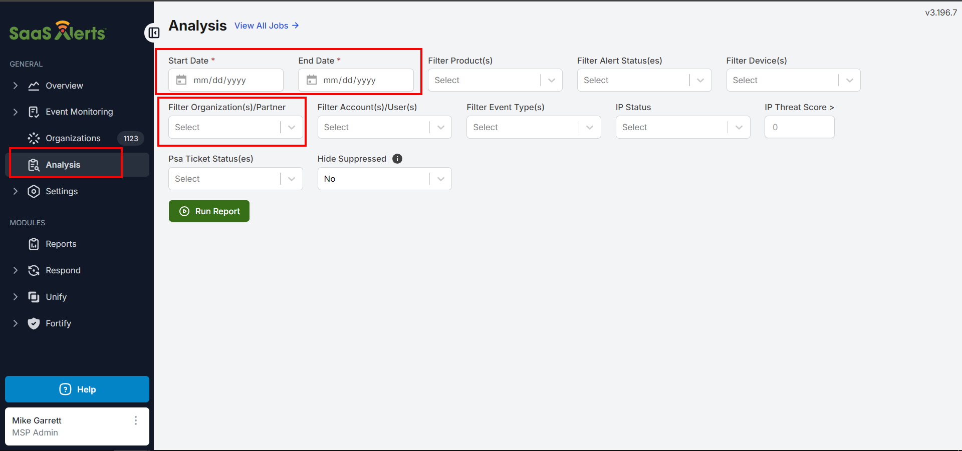- Set your filters and your event parameters to report. (To narrow results choosing at least a single organization is suggested)